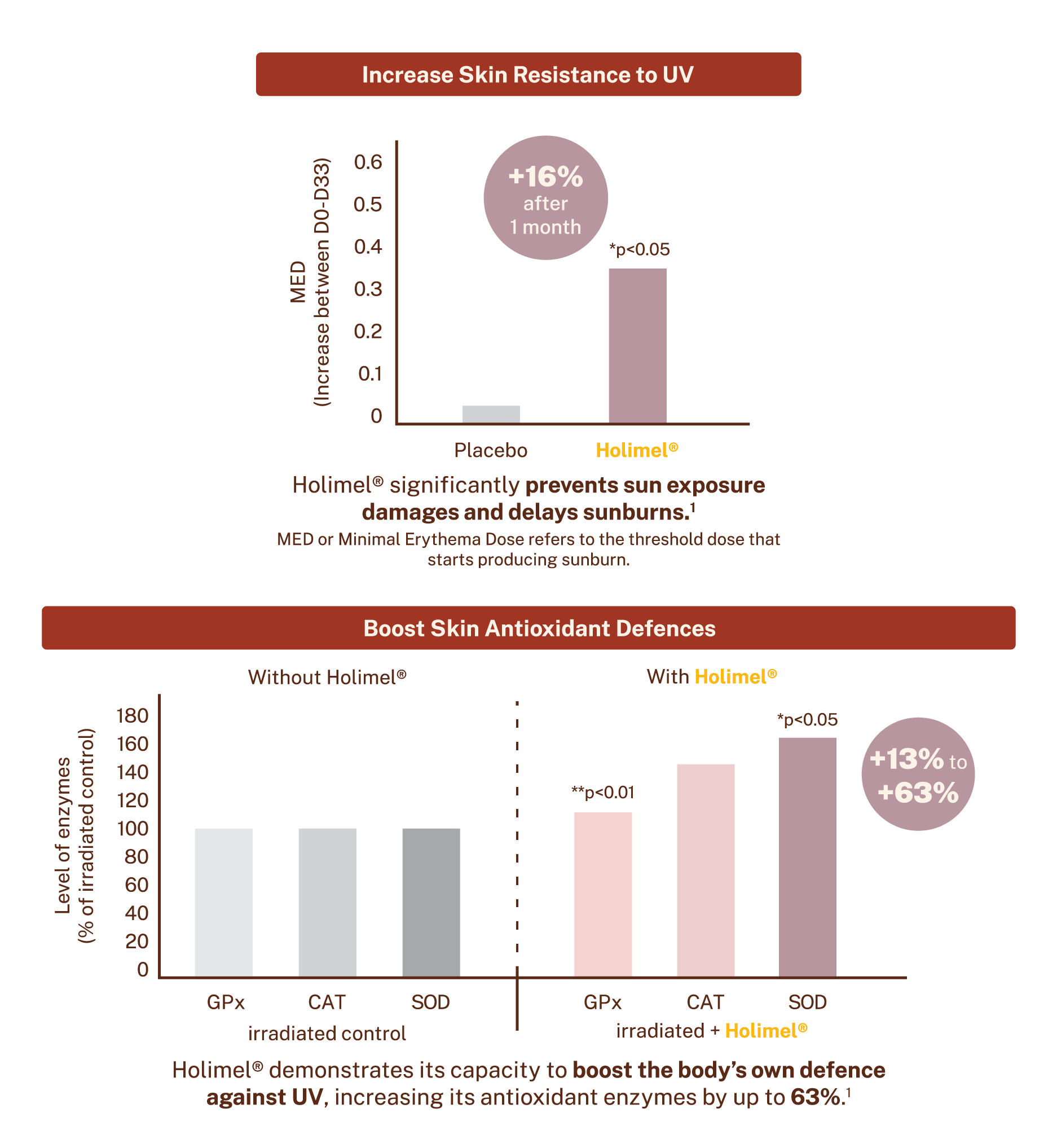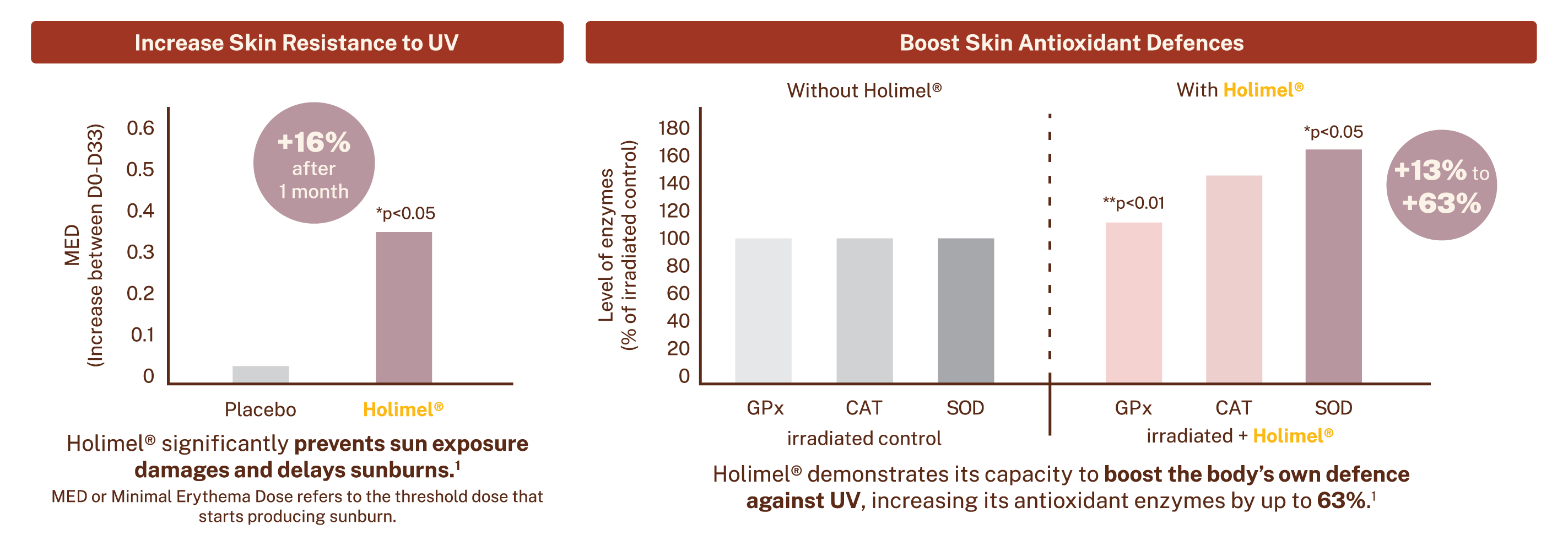 Holimel® is a proprietary cantaloupe melon juice concentrate that is rich in Superoxide Dismutase (SOD). Clinically proven to protect the skin against UV-related damage, it helps prevent the formation of sunburn cells, reduce melanin levels, and enhance the skin's natural antioxidant defences. Holimel® offers an effective daily solution against environmental threats and premature aging.