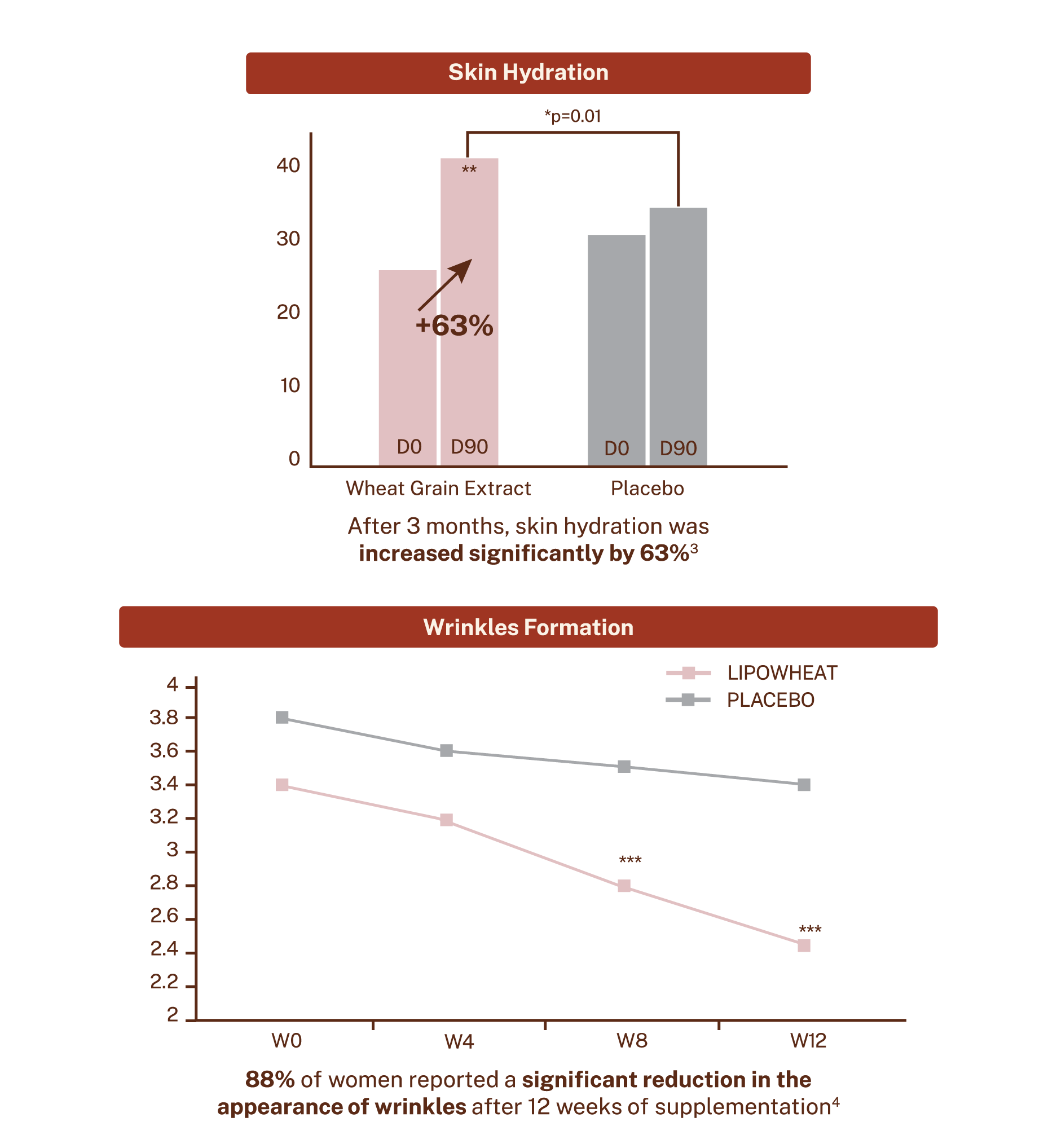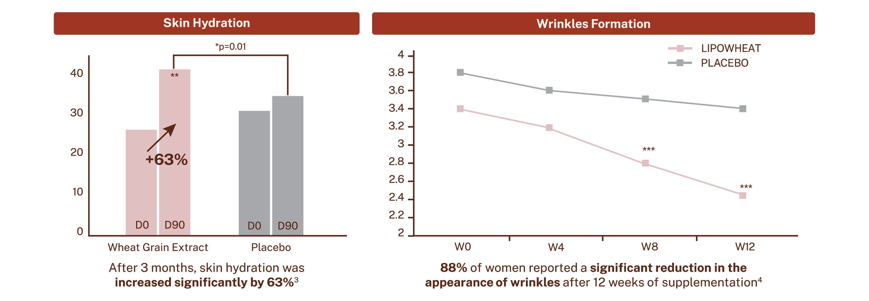 3. Boisnic, S. & BRANCHET, M. C. (2007). Intérêt clinique d'un ingrédient alimentaire à visée hydratante: Lipowheatu. Etude randomisée en double aveugleversus placebo. Journal de médecine esthétique et de chirurgie dermatologique, 34(136), 239-242